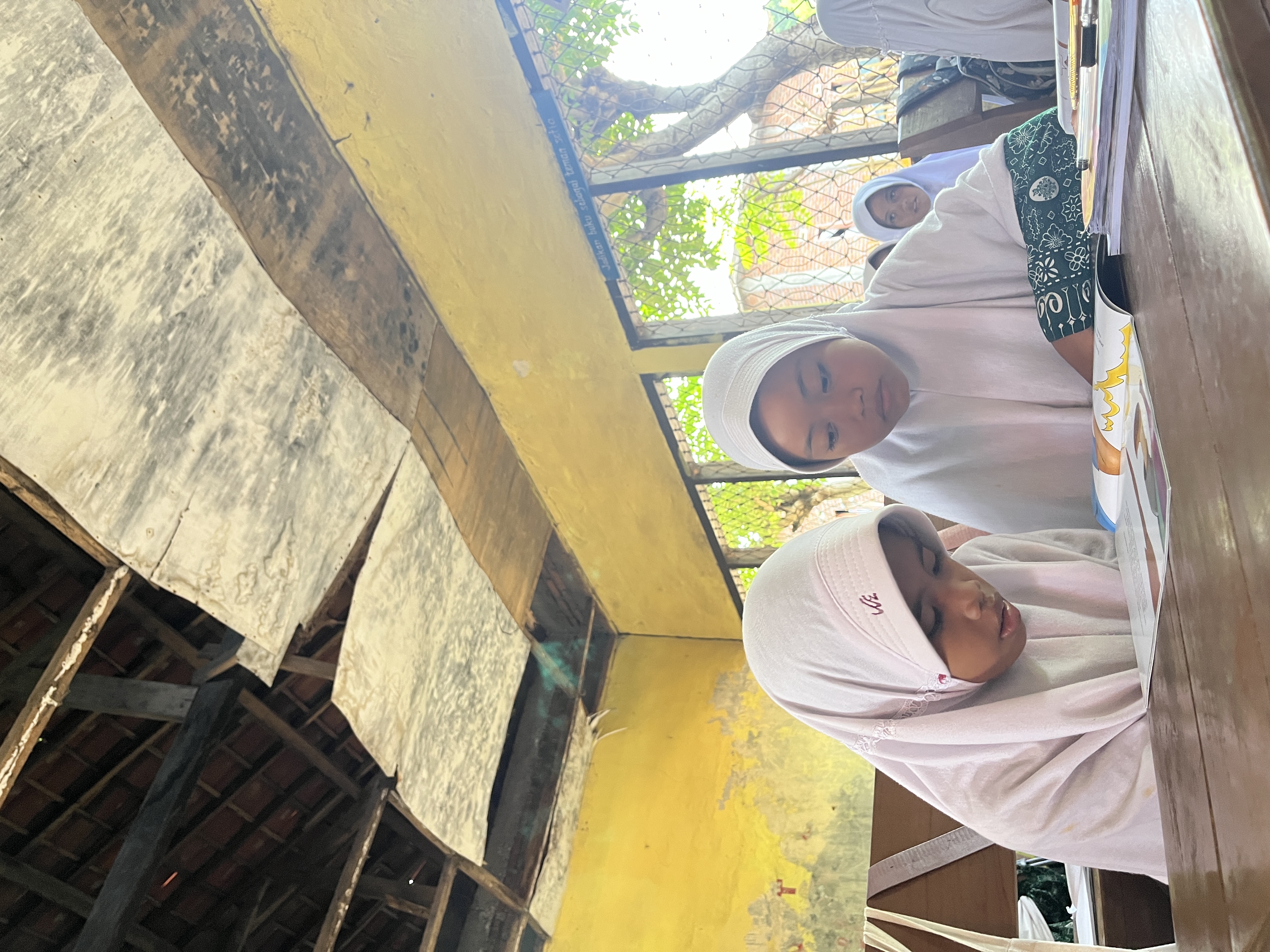 Mereka belajar di ruang kelas dengan kondisi yang jauh dari ideal—lantai retak, atap bocor, dan plafon berjamur. Saat panas, kelas terasa menyengat. Saat hujan, air masuk dan mengganggu proses belajar.
